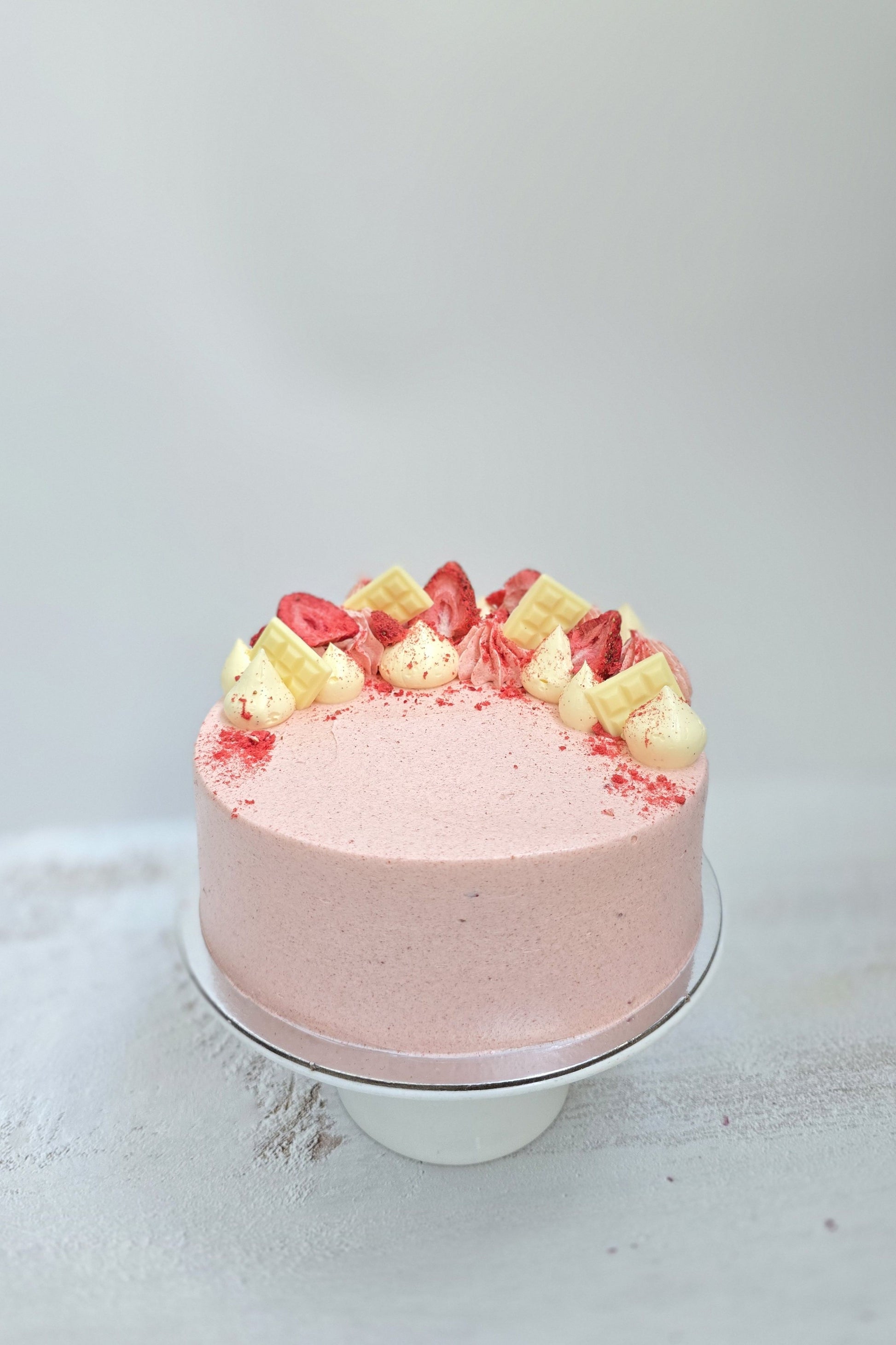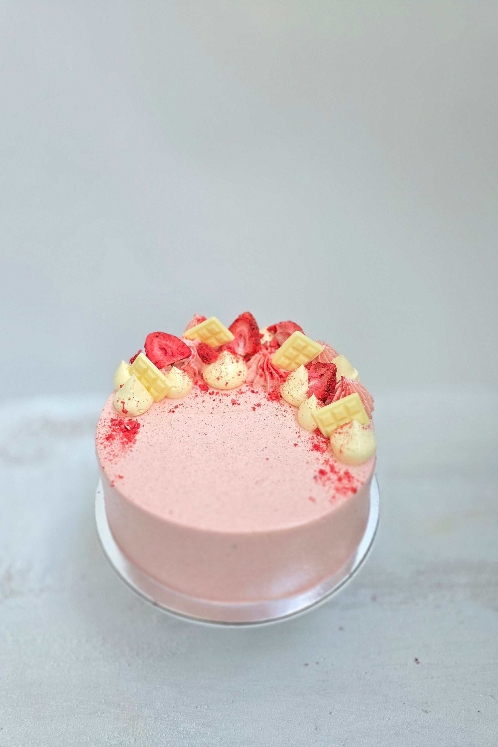 Vanilla and strawberry cake layered with a silky white chocolate buttercream whipped with freeze-dried strawberry powder, giving it a natural pink hue and a burst of real strawberry flavour. Sweet, creamy, and a little nostalgic, it’s the perfect match for anyone who loves classic flavours done beautifully. Finished with freeze-dried strawberries for texture.